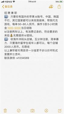 苹果用户注册两年以上美国当地账号帮我充值游戏!充值费用又公司提供!要求有较高美金消费(游戏充值,直播视频会员购买等)全程自己操作,不涉及隐私等安全问题!无垫资无风险!佣金丰厚,做完秒结算从不拖欠!推荐朋友合作成功有红包!联系微信:z458080