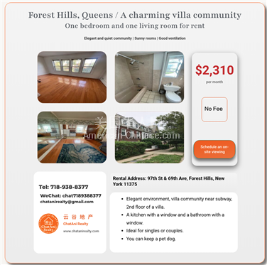 纽约皇后区森林小丘优雅社区别墅_一室一厅出租2310 出租地址: 97st &69th Ave, Forest Hills, New York11375